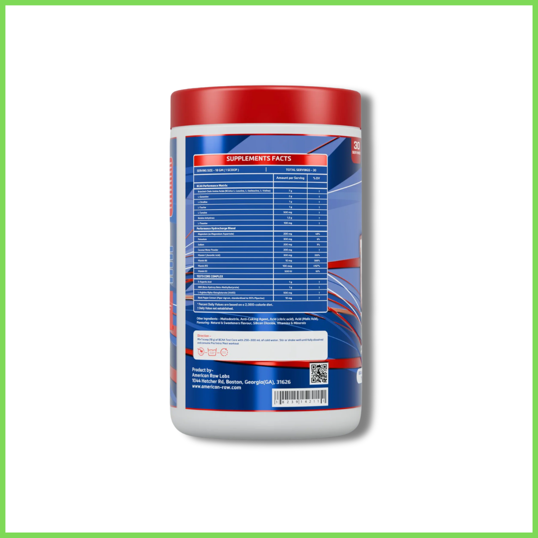 BCAA Test Core by American Raw is a high-performance hydrocharge and recovery formula designed to support muscle repair, hydration, and strength after intense workouts.